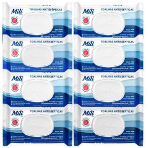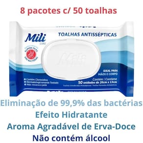 Embalagem com 8 pacotes de 50 unidades, totalizando 400 toalhas Experimente a praticidade aliada à segurança com as Toalhas Umedecidas Mili Antissépticas.