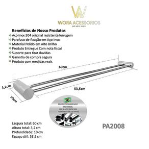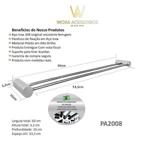 Características: ? Material Premium: Aço Inox 304 — resistência superior à corrosão e longa vida útil. ? Design Duplo: Estrutura funcional com dois níveis — mais praticidade e organização. ? Largura Ideal: 60 cm — perfeito para toalhas de rosto e banho, mesmo em espaços compactos. ? Acabamento Polido: Superfície brilhante com efeito espelhado — mais sofisticação para o ambiente. ? Fixação Oculta: Instalação discreta com visual limpo — sem parafusos aparentes. ? Versátil e Elegante: Indicado para banheiros residenciais, suítes e lavabos refinados. ? Instalação Fácil: Fixação segura com kit completo e manual prático. ? Durabilidade Garantida: Produto com 5 anos de garantia contra defeitos de fabricação.