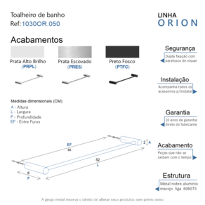 ITENS ENVIADOS: 1 toalheiro de banho 50cm, kit de parafusos e manual instrução instalação.