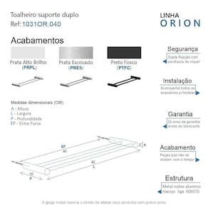 O porta toalhas toalheiro duplo da linha Orion possui um design versátil, é uma peça que se destaca com minimalismo. Além de decorar, organiza com funcionalidade o banheiro. Criado em metal nobre com uma qualidade que abrange áreas litorâneas e possui a de um acabamento muito resistente. Agora é só você adquirir este lindo acessório e fazer o seu projeto se tornar realidade com um banheiro prático para toda a sua família. Características Fabricado em metal alumínio. Disponível no Prata Alto Brilho, Escovado e Preto Fosco. Pode ser instalado em parede, azulejo e porcelanato. Benefícios Fixação prática e segura com parafusos e buchas inclusos. O produto não possui nenhum detalhe em plástico ABS . Fácil higienização, ideal para locais que exigem limpeza constante. Aproveitamento inteligente do espaço, ideal para ambientes compactos. Resistente à corrosão e luz solar. Itens ENVIADOS: 1 toalheiro duplo 40cm, kit de parafusos e manual instrução instalação. Instalação INTELIGENTE Ao 1º furo, use uma broca medida menor, após use a medida correta e finalize, vai ajudar na precisão da fixação da bucha principalmente em azulejos e porcelanato. Marca: Não Informado