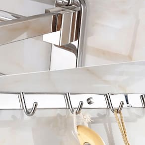 - Feito de Aço Inox, durável e resistente à corrosão e ferrugem - Dobrável, economiza espaço e é fácil de instalar - Suporta até 5kg e tem 5 ganchos para guardar e secar toalhas - Material: Inox - Cor: Cromado - Dimensões Aproximadas: Comprimento total: 58cm, Altura: 17cm, Profundidade: 20cm