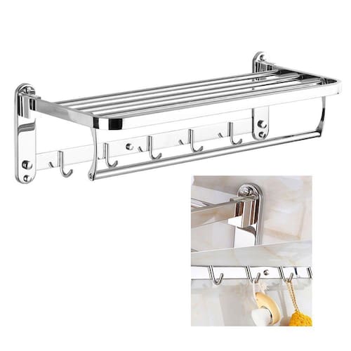 Dobrável, economiza espaço, suporte até 15 kg e ganchos para guardar e secar suas toalhas.