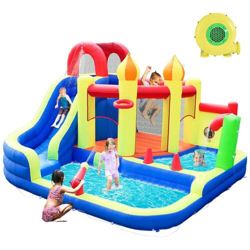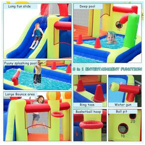 O Tobogã Inflável JOOLOOG é feito de Oxford 840D e 420D, resistente a perfurações, garantindo segurança e durabilidade. Possui proteção com tela de malha ao redor do topo do escorregador para evitar quedas acidentais. Com 8 áreas de diversão, incluindo escorregador longo, parede de escalada, canhão d'água, cesta de basquete, piscina de respingos, piscina funda, jogo de argolas e área de bola. Além de entretenimento garantido, ajuda no desenvolvimento físico e mental das crianças. Acompanha compressor de ar 450W, bolsa para transporte, kit de reparo e estacas para maior estabilidade. Fácil de inflar, desinflar e armazenar, ideal para festas, feriados e diversão em família ao ar livre.