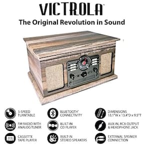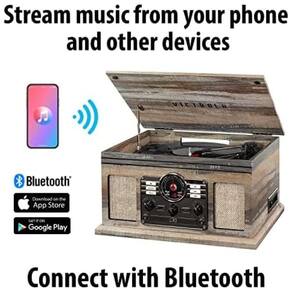 O toca discos com toca discos acionados por correia de 3 velocidades 33 1, 3, 45, 78 RPM reproduz todos os seus discos de vinil e álbuns favoritos Bluetooth para reproduzir música sem fio de seu dispositivo habilitado para Bluetooth, a até 10 metros de distância. CD integrado, cassete e rádio FM com sintonizador rotativo. Rádio am , FM com botão giratório nostálgico e entrada auxiliar de 3, para música de qualquer dispositivo não Bluetooth inclui cabo, entrada auxiliar RCA e entrada para fone de ouvido Sala com alto falantes estéreo de 5 watts Tipo de fonte de energia Elétrica com fio Tecnologia de conectividade Wired Componentes incluídos manual, adaptador de energia Marca: Não Informado