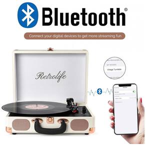 O Toca-discos Retrolife é uma combinação perfeita de elementos modernos e vintage. Com design clássico em couro PU preto, parafusos e redes de metal bronze retro, este toca-discos de maleta é perfeito para levar para todos os lugares com sua alça sólida. Desfrute de criar suas próprias memórias musicais. Suporta 3 tamanhos de discos de vinil (7, 10, 12 polegadas) e 3 velocidades de reprodução (33, 45, 78 RPM) para uma qualidade de som superior. Conectividade Bluetooth integrada, saída RCA, entrada Auxiliar e saída para fone de ouvido para diversas opções. Possui um interruptor de parada automática, modo de troca rápida e é fácil de configurar, ideal para iniciantes e entusiastas de vinil.