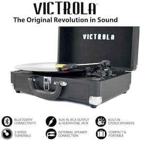 O toca discos de 3 velocidades 33 1, 3, 45, 78 RPM com alto falantes integrados proporciona uma experiência de audição nítida e clara. Transmita músicas facilmente do seu dispositivo inteligente, sem fios bagunçados Com a tecnologia Vinyl Stream, agora você pode reproduzir seus discos favoritos através de qualquer alto falante Bluetooth A entrada auxiliar de 3, significa que você pode conectar qualquer dispositivo não habilitado para Bluetooth para facilitar a audição, e a saída RCA permite que você se conecte aos seus sistemas de som existentes O conector de fone de ouvido integrado permite que você conecte e ouça com privacidade O porta discos Bridge zena mais de 40 de seus discos favoritos e vem com acabamento correspondente