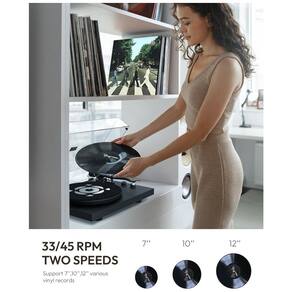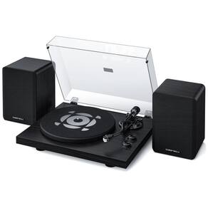 Componentes incluídos: Correia de transmissão, Prato, Tapete deslizante e contrapeso, Tampa contra poeira, Adaptador de energia e de 45 RPM, Guia de início rápido, Manual do usuário, Unidade do toca-discos e alto-falantes de prateleira,
