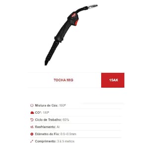 ESPECIFICAÇÕES: Marca: Galzer - Referência: 15AK - Mistura De Gás: 180A - CO2: 180A - Ciclo De Trabalho: 60% - Diâmetro aproximado do fio: 0.9mm - Tipo De Resfriamento: Ar - Comprimento: 3 Metros - Padrão de consumíveis: TBI / BINZEL - Peso aproximado: 1 Kg