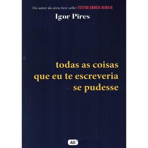 O novo livro de Igor Pires, autor da série best-seller Textos cruéis demais para serem lidos rapidamente, que já vendeu mais de 750 mil exemplares O autor nacional de ficção mais lido em 2020, Igor Pires lança o quarto livro da série Textos cruéis demais para serem lidos rapidamente. Em Todas as coisas que eu te escreveria se pudesse, Igor fala sobre amor, amar e deixar ir, ser intenso e abraçar a sua intensidade. Sobre dizer e sentir tudo sem gaguejar. Sobre enfrentar a dor e aceitar que a cura é um processo contínuo, imprevisível, não linear. Escrita durante a pandemia, a obra é uma coleção de textos poéticos sobre todas as impressões que ficam quando alguém vai embora – ainda que esse alguém seja você mesmo. Além de toda a poesia e sensibilidade características do autor, o livro traz as coloridas ilustrações – que flertam com o surreal – de Jônatas Moreira.