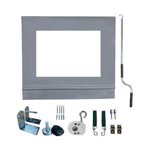 Toldo Cortina Retrátil Com visor: conforme medida anunciada + 15 do bando de acabamentoAcionamento manual lado direito Tecido: Lona PVC 550g/m e espessura de 0,45mmTubos internos em ferro galvanizado Redutor, buchas em alumínioSuporte de fixação em ferro zincado02 mosquetões e suporte de base em inoxparafusos com bucha para fixação no teto ou paredeparafusos com bucha para fixação do suporte de base01 haste de manobra/manivela 1,20m em alumínio