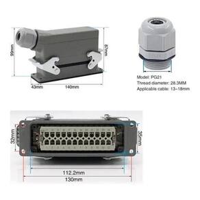 Essa tomada industrial suporta uma tensão de até 500V e corrente de 16A. Seus conectores são compatíveis com fios de 0.5 a 4 milímetros de espessura. O torque do parafuso recomendado para a instalação é de 0.5 N.m.