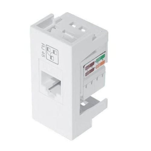 Tomada modulo fame para cabo rj45 8 vias cat 5e Modulo modulare tomada informatica rj45 8 vias cat 5e ref. 1140 fame. Descrição: - design e sofisticação com personalidade - série modulare um conjunto de placas-suporte e mecanismos, com design moderno e arrojado que possibilitam inúmeras combinações, instalação prática e acabamento perfeito, sem aparência dos parafusos. - placas em abs: superfície anti-estática e anti-aderente. - tratamento anti-u.V.A e u.V.B.: maior solidez a luz. - dimensões maiores: melhor cobertura e acabamento.