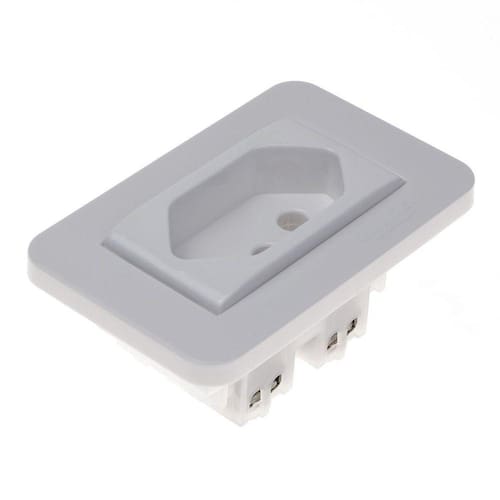 Tomada plus 10a branco lumitek Modelo: 10a Tensão: 250v Profundidade embutimento 27mm Branco1 marque a distância de 24mm e faça 2 furos de 35mm2 coloque o interruptor ou tomada e fixe os parafusos3 encaixe o acabamento aro