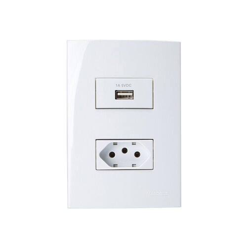 - 1 Tomada USB-A 1A 5W e Tomada 2P+T 10A MarGirius Sleek com Placa e Suporte 4x2