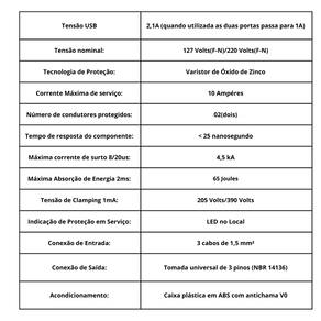 Entrada: Bivolt automático (127 a 220 V) Saída USB: 5 V / 2,1 A (duas portas USB) Proteção: contra surtos de tensão e sobrecarga Tomada protegida: para evitar desconexão acidental Capacidade máxima de absorção de surto: onda de 8x20 s Rede elétrica: 4,500 Amps Tempo de resposta: <25 ms Saída da tomada: 10 A