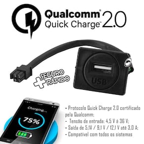 DESCRIÇÃO:Carregue diversos dispositivos com USB Inteligente que utiliza o protocolo Quick Charge 2.0, realizando uma carga segura ao seu dispositivo. Compatível com todos os veículos com tensão entre 4,5V até 36V.Protocolo Quick Charge 2.0O Protocolo QC2 (Quick Charge 2.0) utiliza um sistema inteligente de identificação de tensão e corrente de alimentação ideal para a bateria do seu smartphone, assim realizando uma carga adequada e segura para a vida útil do aparelho. Para smartphone com a função turbo charge o USB Inteligente irá identificar e o mesmo fará a carga rápida.CARACTERÍSTICAS:- Protocolo Quick Charge 2.0;- Certificado pela Qualcomm;- Tensão de entrada 4,5V até 36V;- Saída de 5,1V/ 9,1V/ 12,1V até 3,0 A;- Resistente a água;- Led na cor branca;- Duas opções de acabamento;- Não vicia a Bateria;- Compatível com todos os sistemas operacionais.COMPATÍVEL COM:Carros: TodosMotos: TodosCamionetes: TodosVans: TodosCaminhão: Todos Barcos: TodosLanchas: TodoNavios: TodosIate: TodosJet Ski: TodosCONTEÚDO DA EMBALAGEM:- 01 Usb inteligente Automotivo