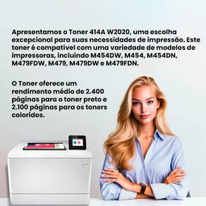 Toner 414A W2020 COM CHIP para uso em: M454DW, M454, M454DN, M479FDW, M479, M479DW, M479FDN Toner preto Rendimento médio de 2.400 páginas Toner cores Rendimento médio de 2.100 páginas Imagens meramente Ilustrativas, podendo variar caixa e outros aspectos do mesmo. Garantia de 03 Meses contra defeitos de fabricação.