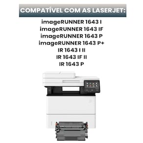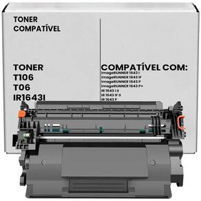 Toner T106, T06, IR1643I Compatível com os modelos laserjet: IMAGERUNNER 1643 I, IMAGERUNNER 1643 IF, IMAGERUNNER 1643 P, IMAGERUNNER 1643 P+, IR 1643 I II, IR 1643 IF II, IR 1643 P Rendimento de até 20.000 páginas. Com garntia