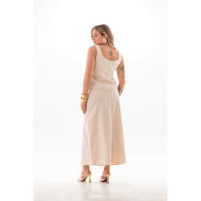 O modelo possui alças largas, decote quadrado e fechamento frontal por botões, trazendo um toque clássico e sofisticado. As costuras aparentes alongam o visual e dão charme extra à peça, enquanto o design levemente acinturado proporciona ajuste perfeito ao corpo.