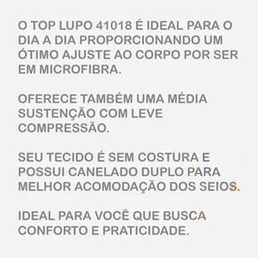Top Lupo Loba Power 41018 Basico Microfibra Sem CosturaTop power básico Lupo LobaModelo sem aro e sem bojo, com uma leve compressão que levanta e sustenta os seiosProduzido com fios especiais que proporcionam excelente conforto e durabilidadeSem costura, o que garante melhor ajuste ao corpoTodo em tecido canelado com base reforçada em tecido duplo, para maior segurança e acomodação dos seiosSuas alças são finas sem regulagem e não possui fecho, são fixas de elástico suaveUtiliza tecnologia Sanitized que garante total proteção antimicrobial (prevenindo a proliferação de micro-organismos causadores de odores)Modelo ideal e perfeito para sustentar os seios.Modo de Lavagem:Lavar a mãoNão alvejarNão secar em secadora rotativaSecar sob a sombraNão passar ferroNão limpar a secoComposição:90% Poliamida e 10% Elastano.Tamanho:P - 36/38M - 40/42G - 44/46GG - 48/50