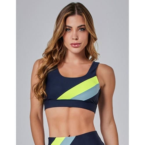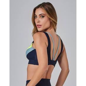 O Top Alta Sustentação Motion possui costas com detalhe em tiras, possui frente com recorte tricolor.