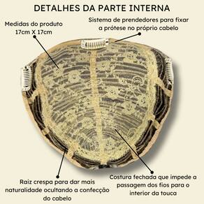 - Fibra orgância premium; - Prótese de tique taque, fácil e prática de utilizar (Sem necessidade de manutenção); - Cabelo com aparência natural; - 5 centímetros de comprimento; - Produto ligeiramente flexível; - Possui quatro tic-tacs internos para fixação segura; - Dimensões 17x17; - 45g em média. Marca: Não Informado Ean: 939354373730