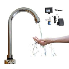 Torneira eletrônica de mesa on-off em latão cromadoTorneira com sensor automática bivolt, ideal para lavatórios profissionais, consultórios, clínicas, banheiros públicos e banheiros para deficiente. A torneira sensorizada de mesa cromada reúne praticidade e conforto para a correta higienização de mãos em qualquer local, evitando a contaminação cruzada em aplicações profissionais. A torneira se adapta facilmente a diversos modelos de pias e cubas e dispensa o contato manual, pois é acionada automaticamente por meio de sensores de presença, gerando economia de até 70% de água, atendendo as exigências da vigilância (nbr 9050).Produto nacional com garantia de até 1 ano para qualquer defeito de fabricação e assistência técnica. É um produto composto de 4 módulos: sensor, fonte, válvula e módulo eletrônico. Reduzindo assim, o custo da manutenção.Funcionamento:Passar a mão em frente do sensor da torneira eletrônica para ligar.Passar a mão novamente em frente do sensor da torneira eletrônica para desligar ou então, a torneira eletrônica vai desligar no tempo programado. A programação para desligar a torneira eletrônica, poderá ser feito a qualquer momento.Praticidade: utilizando a torneira eletrônica, você terá água, mesmo com as mãos ocupadas;Higiene: utizando a torneira com sensor, você evitará contaminação cruzada;Economia: utilizando a torneira sensorizada, você utilizará somente a água que necessita, assim, evitará o desperdício e economizará até 70%;Meio ambiente: utilizando a torneira eletrônica, você estará contribuindo para um mundo mais sustentável.Instalação:- colocar a torneira eletrônica no furo da pia, passar o cabo do sensor, juntamente com o tubo roscado da bica no furo da pia ou bancada.- embaixo da pia ou bancada, passar o cabo do sensor, que vem da torneira eletrônica, no anel de vedação e na flange.- rosquear a flange na torneira eletrônica, até fixar a bica na pia ou bancada.- rosquear a válvula (lado macho) na entrada da água, depois rosquear o engate no lado fêmea da válvula. Utilizar fita teflon para evitar vazamentos.- rosquear o engate no tubo roscado na base da torneira eletrônica. Não utilizar fita teflon.- conectar o cabo do sensor no módulo da válvula.- ligue o cabo da energia elétrica para o funcionamento da torneira eletrônica.Informações técnicas:- tensão de alimentação da torneira eletrônica: bivolt.- pressão de funcionamento da torneira eletrônica: mínima (0,2 kgf/cm) e máxima (8,0 kgf/cm), equivalente a coluna de 2m e 80m respectivamente.- conexão roscável da torneira eletrônica: polegada.- cabo de energia da torneira eletrônica: 1,2m de comprimento- cabo do sensor da torneira eletrônica: 60 cm de comprimento- consumo da torneira eletrônica: 0,3w em repouso e 6,6w quando acionada.- torneira eletrônica: latão cromado com altura de 14cm (entre a base e saída da água).- regulagem para da sensibilidade do sensor no módulo eletrônico.