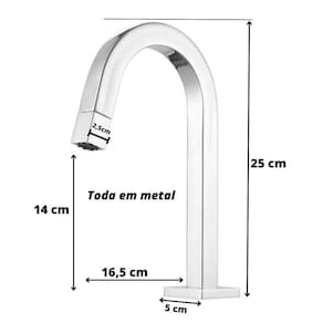Torneira Banheiro Lavatório Quadrada Prática Clean Metal Cromado 1/4 de voltaTorneira 100% Metal.Controle de vazão através do arejador. Design Clean e Sofisticado.Com design moderno, a torneira para lavatório prática é uma excelente opção para deixar seu banheiro mais elegante e prático, garantindo um melhor uso e facilitando sua vida na hora de se higienizar. Elaborada em ligas de cobre, um material de alto padrão que confere grande resistência e durabilidade ao produto, recebe um belíssimo acabamento cromado, dando um toque de estilo e requinte à peça. Somado a isso, conta com acionamento de 1/4 de volta e arejador econômico, reduzindo o consumo de água ao misturar ar com água, aumentando seu volume e proporcionando uma sensação de maior quantidade.Valorize sua casa com uma funcional e bonita Torneira.Controle de vazão através do arejador. Design Clean e Sofisticado.Torneira fabricada em metal latão alta resistência e durabilidade, proporcionando um custo-benefício sem igual.Sistema de Acionamento 1/4 de volta com pastilhas cerâmicas.Fácil instalação e manutenção.Ideal para cubas de apoio ou sobrepor.MEDIDAS:Altura 24cmBica até a base 13 cmProfundidade 14 cmVocê vai se surpreender com a qualidade da torneira.Recomendações de Uso, Manutenção e Limpeza: Limpar a torneira apenas com um pano macio e sabão neutro.Não usar produtos abrasivos como: sapólio, palha de aço e produtos químicos.