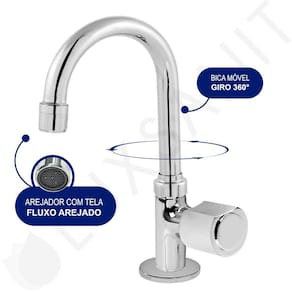 Diferenciais: -bica móvel permitindo levar a água horizontalmente com giro 360. -arejador com tela garantino um fluxo de água espumado. -mecanismo 1/4 de volta gerando praticidade e economia ao abrir e fechar não precisa girar demasiadamente .