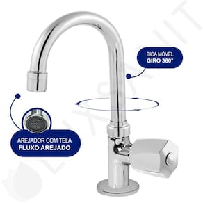 Diferenciais: -bica móvel permitindo levar a água horizontalmente com giro 360. -arejador com tela garantino um fluxo de água espumado. -mecanismo 1/4 de volta gerando praticidade e economia ao abrir e fechar não precisa girar demasiadamente .