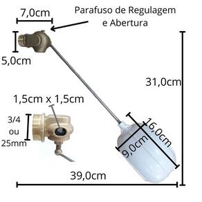 MODELO: - Vasão Total, não restringe a entrada de água - Fechamento a base de Sanfona de Borracha - Corpo de Metal - Haste de Metal - Boia ou Flutuador de Plástico - DN25mm - 3/4
