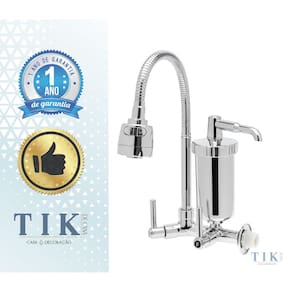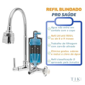 Torneira gourmet com filtro modelo parede Acompanha 1 refil instalado + 03 extra Trocar a cada 06 meses por recomendação do inmetro possui certificação autorizada pelo inmetro no refil, elemento filtrante responsável pela limpeza da água seu design é inspirado para praticidade ao lavar louças trabalha junto à sustentabilidade com redução no fluxo contínuo de água seu modo de filtragem é processado por refil blindado sistema de filtragem com carvão ativado possuí retenção de partículas informações técnicas Produto: torneira com filtro cozinha parede gourmet; Ligação: 1/2 acompanha adaptador 3/4 ; Refil incluso: 04 refil; Utilização: cozinha; Fixação: parede; Material: liga de cobre/partes em abs; Acabado: cromado; Acionamento: 1/4 de volta; Pressão mínima recomendada: 04 mca; Pressão máxima suportada: 30 mca; Temperatura suportada: 0°c até 90°c; : 12 meses;