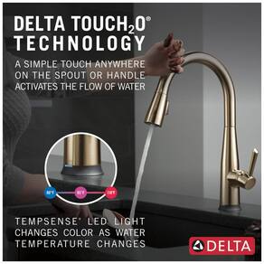 A torneira de cozinha com tecnologia Delta Touch2O permite que você ligue e desligue o fluxo de água com um simples toque em qualquer lugar da bica ou alça, usando o pulso ou antebraço. A luz LED TempSense indica a temperatura da água, evitando surpresas desagradáveis. O encaixe MagnaTite Docking utiliza um ímã poderoso para manter o bastão de pulverização no lugar, evitando quedas. A limpeza é fácil com os furos de spray TouchClean. A torneira pode ser instalada em configurações de furo único ou 3 furos, 20 cm, e vem com uma placa de deck opcional e linhas de fornecimento InnoFlex PEX integrada. A tecnologia Touch2O é intuitiva e reduz as chances de ativação falsa. A torneira funciona com bateria 6 AA incluída com duração aproximada de 1 ano ou 6 C não incluída com duração aproximada de 3 anos. O adaptador AC opcional EP102157 pode ser encomendado separadamente.