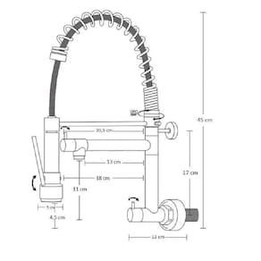 Torneira Cozinha Gourmet Parede Bica Móvel Ducha Agua Fria Colors Utilização: Cozinha / Área Gourmet / ChurrasqueiraAcabamento: Camada Tripla de CromoMaterial: Metal Brass (Latão cobreado)Qualidade: Material e reparos de altíssima durabilidade (inclusive em região com Maresia)Tipo: GourmetSaídas de água: 1 principal + 1 sprayReparo interno: Cartucho cerâmicoPressão para funcionamento: De 3 a 122 M.C.A.Altura: 50 cmComprimento total: 30 cmAltura da base até a saída de água principal: 12 cmDiâmetro da base: 3 cmDistância horizontal da base da torneira até a saída de água principal: 21 cmDistância entre o centro da tubulação até a fixação superior: 19 cmDistância da fixação superior até o ponto mais alto da torneira: 27 cmItens Inclusos- 1 Torneira Gourmet- Acessórios de fixação