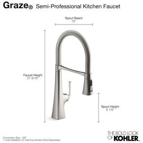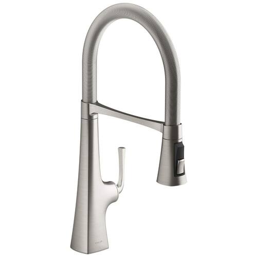 A torneira KOHLER K22061VS Graze é uma ótima escolha para quem busca uma torneira semiprofissional de alta qualidade para a pia da cozinha. Fabricada em aço inoxidável vibrante, ela possui uma tampa de mangueira easyclean e um cabeçote de pulverização SwitchGrip que gira em incrementos de 90 graus, permitindo que você ajuste a direção dos botões como preferir.