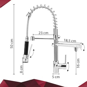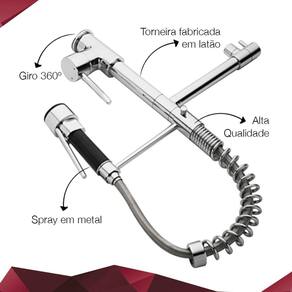 - Altura Total (Presa): 50 cm - Altura Total (Solta): 56 cm - Largura Da Base: 5 cm - Distância Da Base Até A Queda D'água Da Bica Fixa: 16 cm - Distância Da Base Até a Ducha Manual (spray) Presa: 8 cm - Conexão: 1/2 - Peso: 1.814 kg - Material Do Corpo: Latão - Material Do Gatilho: Latão - Pressão Mínima Para Funcionamento: 3 m.c.a - Arejador (Bica Fixa): Com Arejador - Furo De Instalação: 3,2 cm - Tipo de Flexível: Espiralado - Acabamento: Cromado - Área Indicada: Cozinha
