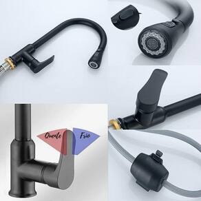 -Design gourmet preto que se destaca em qualquer cozinha. -Funcionamento monocomando para controle fácil de temperatura e fluxo de água. -Rotação de 360 graus para acesso conveniente a todas as áreas da pia. -Spray com jato ajustável para lavagem eficaz de alimentos e utensílios. -Acabamento resistente a manchas e arranhões para longa durabilidade. -Instalação descomplicada, compatível com a maioria das pias padrão. -Por que Escolher Nossa Torneira de Cozinha Gourmet Preta Monocomando: