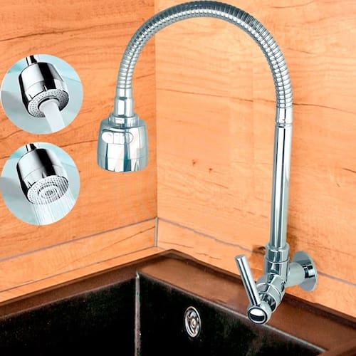 A Torneira Gourmet Flexível Parede para Cozinha apresenta arejador, podendo ser instalada em parede de 1/2 ou 3/4.
