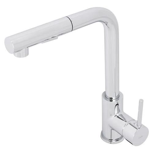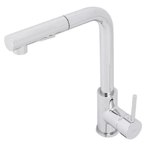 A torneira inclui um chuveirinho, perfeito para quando você precisa de uma limpeza mais intensa ou precisa preencher recipientes que não cabem na pia. O arejador fixo ajuda a economizar água, gerando um jato mais uniforme e com menos respingos.