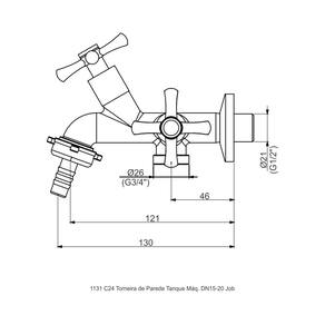 Torneira De Parede Para Tanque E Maquina De Lavar - Job - 1131 Torneira metálica de parede compacta e resistente indicada para tanque e máquina de lavar roupas. Composição básica: ligas de cobre, plásticos de engenharia e elastômeros. Acabamento superficial biníquel cromado que proporciona alta resistência à corrosão. Bitola de 1/2' DN15 . Acionamento de volta com pastilha cerâmica. Furo na parede: 25mm a 30mm. Produto de Fácil Instalação. Acompanha: Torneira, adaptador de 3/4 DN20 e bico união, que além de direcionar o jato de água, evitando respingos desnecessários, serve para acoplar mangueiras de jardim. Cor: Cromado Observações: Foto Ilustrativa. Não incluso instalação. Marca: Não Informado