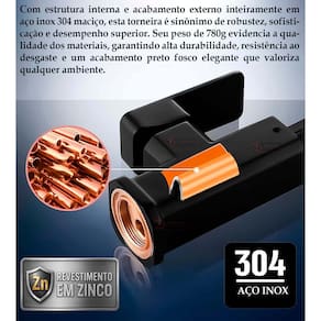 Fabricada inteiramente em aço inox 304 maciço, esta torneira monocomando é sinônimo de durabilidade, robustez e elegância. Com acabamento externo em preto fosco e estrutura interna resistente à corrosão, ela é ideal para quem busca qualidade superior e longa vida útil. Seu peso de 780g reforça a qualidade premium dos materiais utilizados.