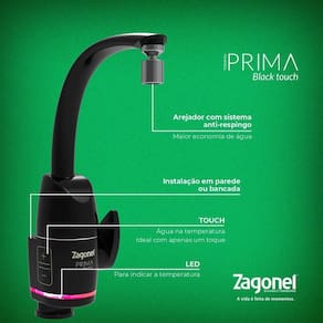 Características Gerais do Produto: • Tensão: 220V • Cores Disponíveis: Branco; Preto • Garantia: 1 Ano • Marca: Zagonel • Proteção: IP 24 • Cor: Branco; Preto • Disjuntor: 32A • Modelo: Parede ou Bancada • Pressão de Funcionamento: 20 a 400Kpa (2 a 4 M.C.A) • Eficiência Energética: D