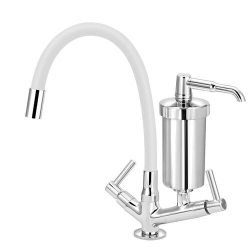 Torneira Filtro Gourmet Flexível Colorido Mesa Luxo 1/4 V Cor: Branco 5 Cores Disponível. Torneira bica móvel 360 giratória de cozinha para instalação na mesa, modelo gourmet, fabricada em metal cromado. Possui arejador. Sua bica flexível gourmet oferece flexibilidade de uso, podendo ajustá-la para o local mais adequado sem perder a rigidez do posicionamento, gerando melhor conforto e facilidade de uso para o dia-a-dia. Sua bica fabricada em metal inoxidável permite longa vida em seu acabamento, proporcionando eficiência em sua estética durante longo tempo. O produto conta também com filtro completo, incluindo o elemento filtrante vela em carvão ativado aprovado pelo INMETRO, absorvendo o máximo de impurezas, podendo ser utilizada para o consumo humano. Além disso, conta com mecanismo de abertura e fechamento 1/4 de volta, gerando mais economia e conforto ao manusear, com maciés e rapidez, trazendo mais economia de tempo e água. DETALHES TÉCNICOS Tipo de bica: gourmet, móvel, giratória 360; flexível; Tipo de mecanismo: 1/4 de volta cerâmico; Tipo de filtro: ABS cromado: Tipo do elemento filtrante vela : carvão ativado; Composição do produto: torneira é fabricada toda em metal cromado e usinada sob processo extrusivo; bica fabricada em aço inoxidável; Filtro cromado em ABS de alta resistência. Marca: Lhd Metais