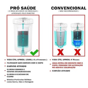 Torneira Gourmet Com Filtro Cozinha De Parede Metal 1/4v. Torneira Gourmet Com Filtro Cozinha De Parede Metal 1/4v. Torneira em metal 3/4 robusta certificado pelo INMETRO, filtro e chuveirinho em ABS, plástico de engenharia altamente resistente. Especificações Pressão Mínima: 4 mts 4 MCA metros de coluna d'água para um bom funcionamento Entrada de água: 1/2 com adaptador para 3/4 Mecanismo de acionamento: metal cerâmico 1/4 volta Filtro: Tecnologia moderna Pró Saúde garante uma filtragem ainda mais eficiente, Certificado Inmetro. Refil: Blindado Água não entra em contato com o copo do filtro Tubo: Gourmet Móvel até 360 Graus Dimensões: Altura posição normal: aproximadamente 28cm : - 90 dias de contra defeito de fabricação e mecanismo de vedação. Observação: Certifique-se de que a foto do produto é o modelo correto para sua instalação Parede ou Bancada . - Recomendações de Uso, Manutenção e Limpeza: Limpar a torneira apenas com um pano macio e sabão neutro. Não usar produtos abrasivos como: sapólio, palha de aço e produtos químicos.