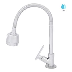 Resumo das Caracteristicas: - Marca: Delinia - Produto: Torneira - Local(is) Indicado(s): Pia - Comodo Indicado: Cozinhas - Temperaturas da Agua: Agua Fria - Tensao Eletrica: Sem Tensao Eletrica - Bica: Alta - Mobilidade da Bica: 360o - Flexibilidade da Bica: Flexivel - Tipo do Jato de Agua: com Chuveirinho - Tipo de Torneira: Comum - Tipo de Acionamento Torneira: 1/4 de Volta - Formato do Acionamento Torneira: Alavanca - Acompanha Arejador: Sim - Mobilidade do Arejador: Arejador Fixo - Altura da Base ate a Saida de Agua: 22,00 cm - Profundidade da Torneira: 23,00 cm - Altura: 43,00 cm - Largura: 23,00 cm - Profundidade: 8,00 cm - Diametro do Furo em Polegadas: 1/2 "" - Pressao Indicada: Alta Pressao - Pressao de Funcionamento Minima: 3,00 mca - Pressao de Funcionamento Maxima: 40,00 mca - Cor: Cromado - Tonalidade: Prata - Material: Metal - Tipo de Material" Marca: Não Informado