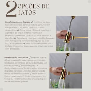 Destaques do Produto: Misturador Monocomando: Controle fácil da água quente e fria com um único manípulo, economizando espaço na bancada. Ducha Flexível: Suporte em mola e alta flexibilidade para lavar alimentos e utensílios com mais praticidade e segurança. Bica Giratória 360°: Maior alcance e agilidade para limpar grandes recipientes e manusear utensílios na pia. Arejador : Fluxo de água eficiente, que economiza e proporciona mais conforto no uso. Design Resistente e Elegante: Fabricada em metal e plástico ABS, com acabamento dourado Brilhoso, ideal para cozinhas de qualquer estilo.