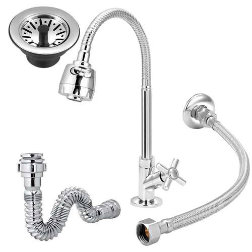 Torneira Gourmet Cozinha+Flexível+Válvula/Americana+Sifão Torneira Gourmet Cozinha+Flexível+Válvula/Americana+Sifão. Itens Inclusos: Torneira Cozinha Alavanca De Mesa Tubo Gourmet 1/4v DADOS TÉCNICOS - Feito em ABS plástico de engenharia com alta resistência e durabilidade . - Tubo Flexivel com dois jatos. - Mecanismo 1/4 de volta com pastilha cerâmica. - Pressão de água: 02 a 40 M.C.A. MEDIDAS - Altura: 35 cm - Profundidade: 26 - Tubo Flexivel: 50 cm Engate Aço Inox Flexível Trançado 1/2 40 Centímetros. Produto indispensável para a instalação de torneiras, o engate flexível é um equipamento que não pode faltar na cozinha,banheiro,Lavanderia da sua casa. Pensando nisso, este excelente modelo é uma ótima escolha para garantir o bom funcionamento de suas torneiras Utilizado para a ligação entre a rede hidráulica e a torneira, é produzido em aço inox, um material de grande resistência e durabilidade que confere alto padrão à peça. Por ser flexível, adapta-se a qualquer tipo de instalação. Válvula Americana para Pias Cubas e Tanques 3 1/2 em Aço Inox e Polipropileno. - Ela serve em furo de 7 a 9 cm. - Medida: Possui um diâmetro de 3 1/2 polegadas, o que é um tamanho padrão para válvulas de dreno em pias, cubas e tanques. - material: Fabricada em aço inox e polipropileno. O aço inox proporciona resistência à corrosão e durabilidade, enquanto o polipropileno oferece uma vedação eficaz e flexibilidade para o uso diário. Sifão Sanfonado/extensivo Universal Abs Cromado - Fácil instalação Dispensa o uso de ferramentas. - Suporta água quente e fria. - Peça única evitando vazamentos. - Diversas situações de entrada. - Fácil de retirar para limpeza. - Sifão aberto possui Comprimento 70 cm Adaptável às válvulas de 7/8, 1.1/4 e 1.1/2, com saídas de esgoto DN 38, 40, 48 e 50. - 03 meses de contra defeito de fabricação e mecanismo de vedação. Recomendações de Uso, Manutenção e Limpeza: Limpar a torneira apenas com um pano macio e sabão neutro. Não usar produtos abrasivos como: sapólio, palha de aço e produtos químicos. Marca: Não Informado