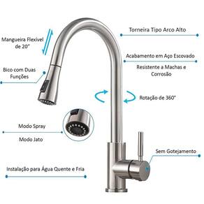 Características: - O bico da torneira possui rotação de 360° graus oferecendo melhor desempenho na lavagem de louças e pia. - O bico de spray de tração apresenta uma mangueira longa que fornece um alcance de 50cm. - A Torneira possui um misturador de água quente e fria, através de uma saída de água de modo duplo. - Possui também uma alça única com configurações de 2 modos (stream / spray), fluxo para encher água, spray para enxágue,que pode atender ao seu uso diário e conveniente para todos os tipos de trabalhos de cozinha. - Conta com um acabamento em níquel escovado, feito de aço inoxidável SUS304. - Seus cartuchos de tinta cerâmica e o borbulhador são de alta qualidade, sendo assim torna a torneira mais durável e resiste à sujeira e corrosão do uso diário.