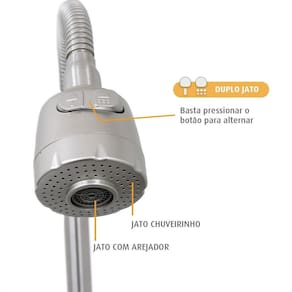 Com bica flexível e rotação de 360º, permite total liberdade na direção do jato, enquanto o arejador duplo jato em ABS oferece duas funções: jato contínuo e jato tipo chuveirinho – alternância rápida com o toque de um botão!