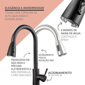 Com uma ducha pré-lavagem flexível, possui suporte em mola para sustentação e segurança. Conta com uma saída de água tradicional com mecanismo 1/4 de volta e bica giratória, com arejador em aço inox com tela para um fluxo de água arejado. Marca: Não Informado